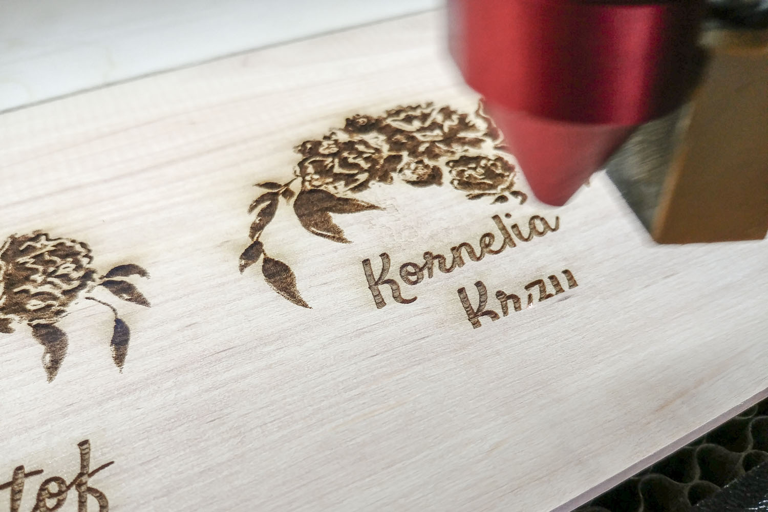 Własnoręcznie namalowany wzór orchidei dostarczyła Klientka. Podkładki wygrawerowaliśmy i wycięliśmy laserem CO2 w lamelach drzewa olchowego o grubości 4 mm.