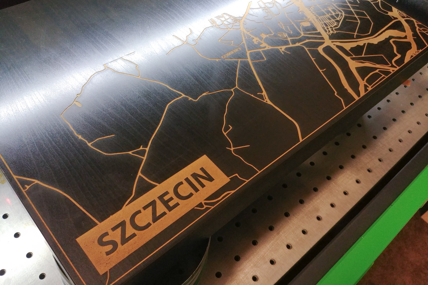 Kontynuując poszukiwanie zastosowań graweru laserowego pewnego dnia pojawiła się inspiracja i potrzeba zapełnienia blatu stolika kawowego, który został przypadkowo lekko zarysowany. Na jednolitej czarnej płaszczyźnie rysę łatwo było zobaczyć, więc zdecydowałem, że wygraweruję tam mapę Szczecina z oznaczeniem kilku punktów 🙂