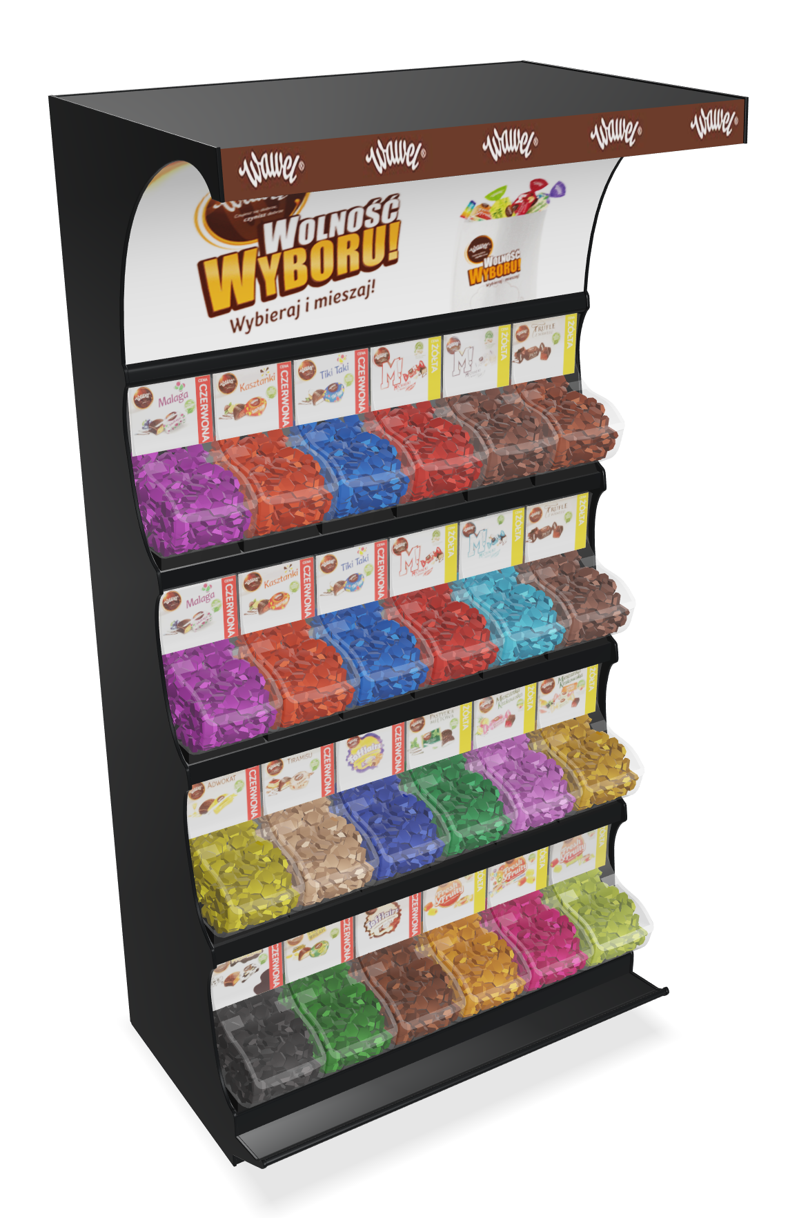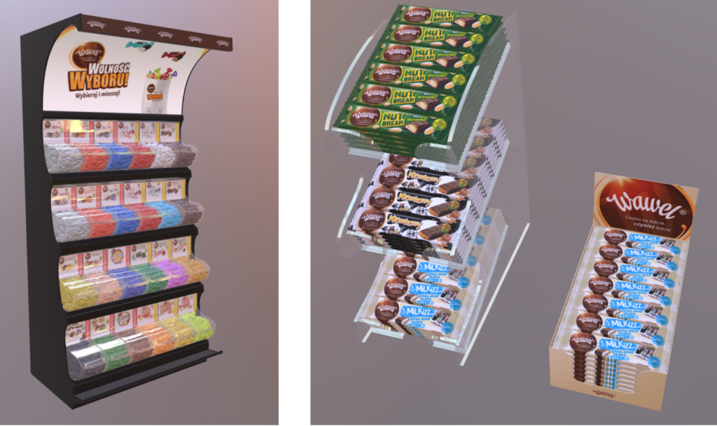 Na potrzeby prezentacji modułu rozszerzonej rzeczywistości (AR) przygotowałem modele 3D ekspozytorów. Jeden stojący i dwie odmiany ekspozytorów na blaty. Model stojący jest wypełniony uproszczonymi modelami zamiast cukierków ze względu na konieczność utrzymania jak najmniejszego rozmiaru pliku końcowego.