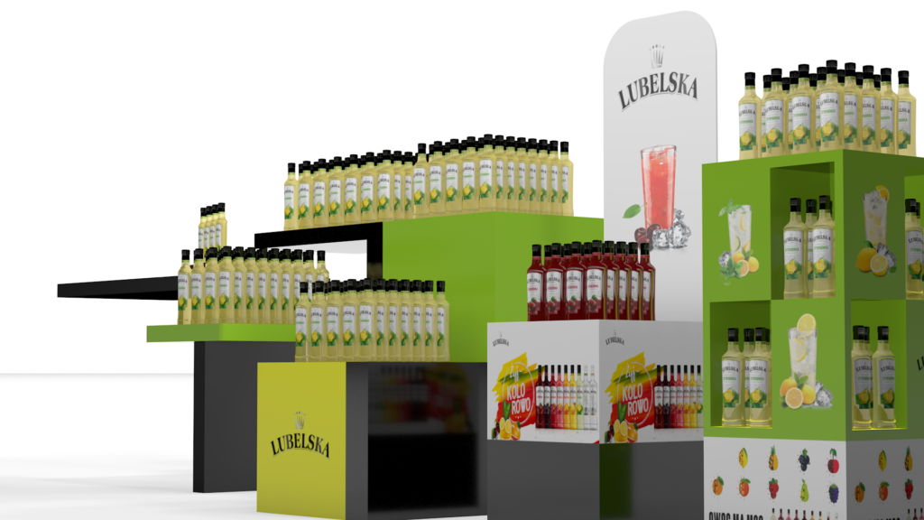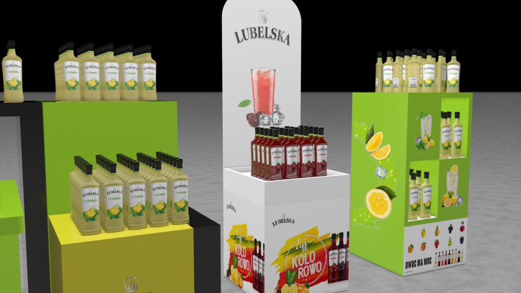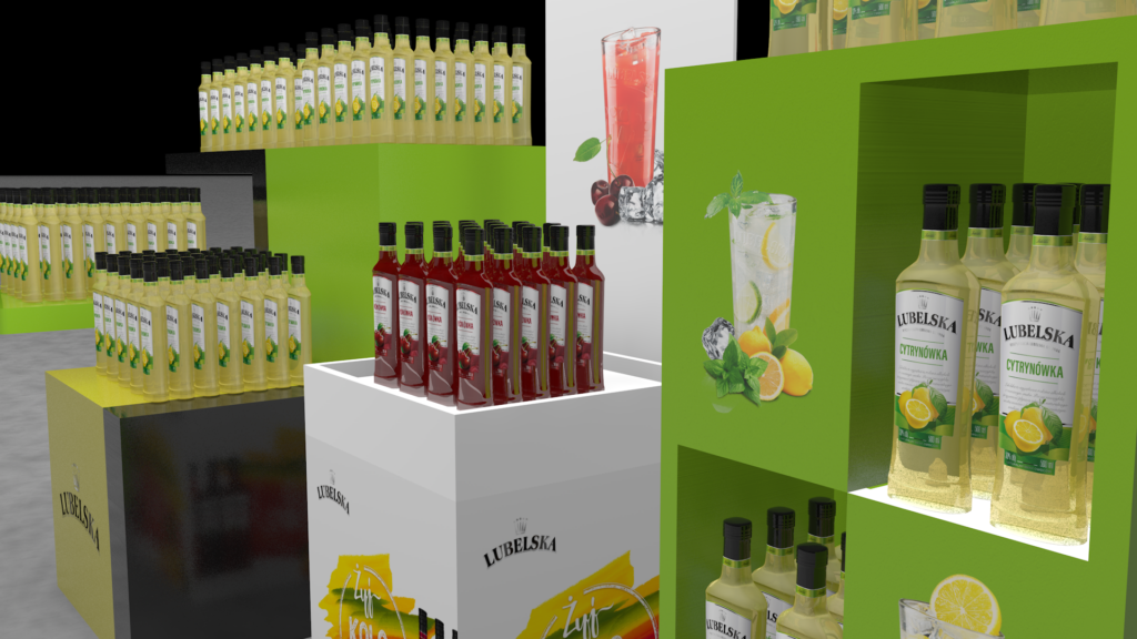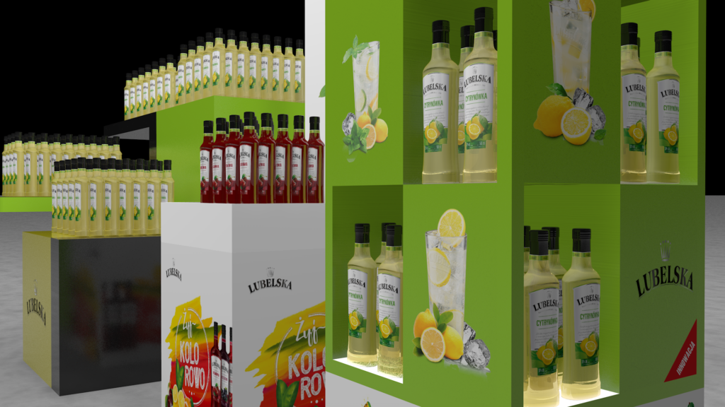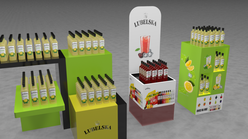 Przygotowałem modele 3D produktów marki Lubelska oraz kilka testowych wizualizacji z przykładowymi ekspozytorami.